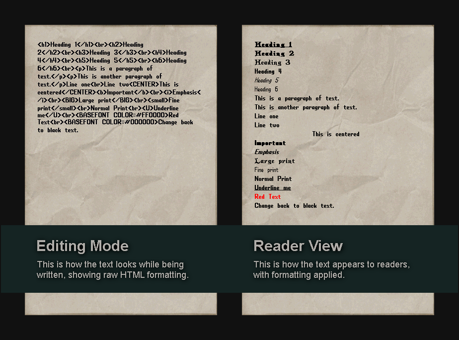 Many systems in Icebound allow for longform writing. To help bring your writing to life, we support basic HTML formatting within these entries. This lets you structure your text with headings, paragraphs, and other simple elements to improve readability and make the most of the available space: